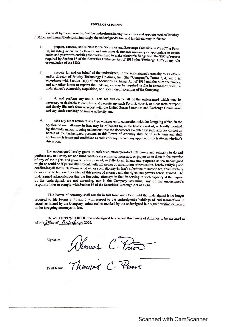 | 4. Includes 2,500,000 shares of PRTH common stock held by Lori A. Priore, the spouse of Thomas C. Priore, and Bernard H. Smyers, in their capacity as trustees of the Thomas C. Priore Irrevocable Insurance Trust u/a/d 1/8/2010, for the benefit of Lori A. Priore and the children of Thomas C. Priore and Lori A. Priore. Also includes 10,000,000 shares of PRTH common stock held by Lori A. Priore, the spouse of Thomas C. Priore, in her capacity as trustee of the Thomas Priore 2019 GRAT, for the benefit of Lori A. Priore and the children of Thomas C. Priore and Lori A. Priore. |