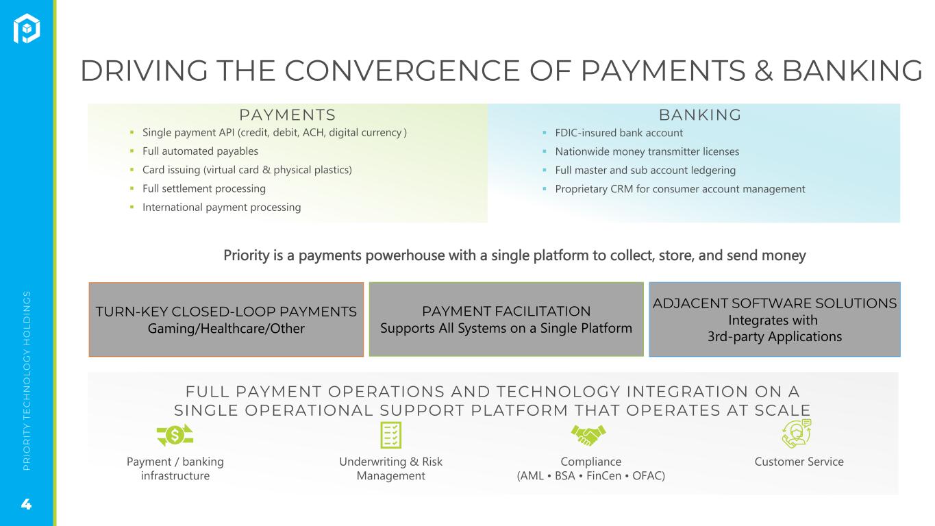 P R IO R IT Y T E C H N O L O G Y H O L D IN G S $231 $68 $53 $8 $5 $36 $32 $24 Revenue Gross Profit ADJ EBITDA Consumer Commercial Integrated Priority is a leading digital payment company purpose built to monetize payment (or merchant) networks in Consumer, Commercial B2B, and Integrated Software verticals leveraging a single operating and compliance platform to collect, store and send money PRIORITY OVERVIEW PRIORITY TECHNOLOGY HOLDINGS (1) Gross profit (“GP”) is a non-GAAP measure defined as revenue less cost of revenue, including, but not limited to, processing and residual expenses. (2) 2021 PF includes pro forma combined actual results for PRTH, Finxera, and Q2 2021 reseller acquisitions. (3) Adjusted EBITDA is EBITDA adjusted for non-recurring expenses and non-cash stock-based compensation. Total Adjusted EBITDA includes $(9) of Corporate expense.3 Six Months Ended June 30, 2021PF BY SEGMENT (1,2) ($mm) $68 $105 $275 Adjusted EBITDA as % of Gross Profit: 65% ■ Priority Technology Holdings, Inc. (NASDAQ: PRTH), a technology company serving the payments industry with a single technology platform to collect, store and send money. ■ Priority has built a reputation for delivering value to its customers, and our pioneering approach allows companies to focus on their core business while Priority handles the risk, underwriting, and all other aspects of making or taking payments. This approach relies on best-in-class technology and award-winning service along with unparalleled expertise in the payments space. Priority’s solutions are delivered via internally developed payment applications and services to the Consumer Payments, Commercial Payments, and Integrated Partners business segments ■ CONSUMER PAYMENTS: Provides full-service payment processing and payment- enabled solutions for B2C transactions, leveraging Priority’s proprietary software platform, distributed through ISOs, agents, banks, and ISVs ■ COMMERCIAL PAYMENTS: Provides market-leading accounts payable automation software, payment processing and managed services to industry leading financial institutions (including Citi, MasterCard, and AMEX) and corporations ■ INTEGRATED PARTNERS: Provides vertical-specific payment-enabled software solutions for high-growth markets that are early in the conversion to digital payments