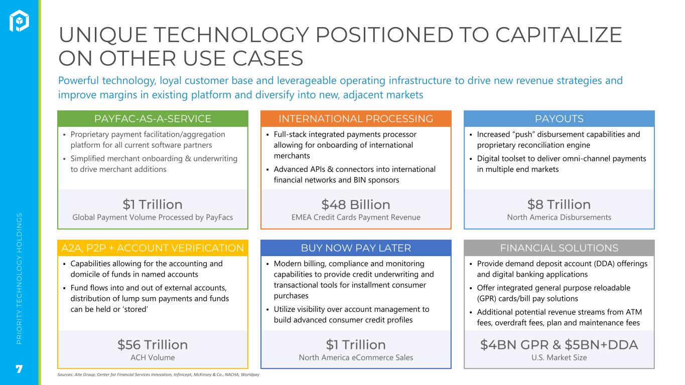 P R IO R IT Y T E C H N O L O G Y H O L D IN G S One Stop Shop for Taking + Making Payments + Managing Business/Consumer Operating Accounts UNMATCHED RESOURCES TO MONETIZE MERCHANT NETWORKS Tenant Landlord Supplier Property Management Software OMNI-CHANNEL REAL ESTATE PAYMENTS Residential / Commercial / Vacation Gig Company / Software EE/Gig Worker Consumer FULL-FUNCTION GIG / SOFTWARE Gig Platform / Hospitality TURN-KEY CLOSED-LOOP PAYMENTS Gaming / Healthcare / Other PRIVATE CLOUD INFRASTRUCTURE + TECHNOLOGY SUPPORT / FULL-SERVICE PAYMENT OPERATIONS (TO COLLECT, STORE & SEND MONEY) API INTEGRATION LAYER ▪ Collect Rent & Fees ▪ Deposit & Escrow Management ▪ AP Automation ▪ V-Card Supplier Payments ▪ Supplier Payments ▪ Tips / Worker Payments ▪ Consumer Payments ▪ Employee / Gig Worker Account ▪ Funds Load ▪ Pre-Paid Card Payout ▪ E-Wallet Account ▪ Card Issuing Versatility Card Holder Merchant Vertical ISV 6