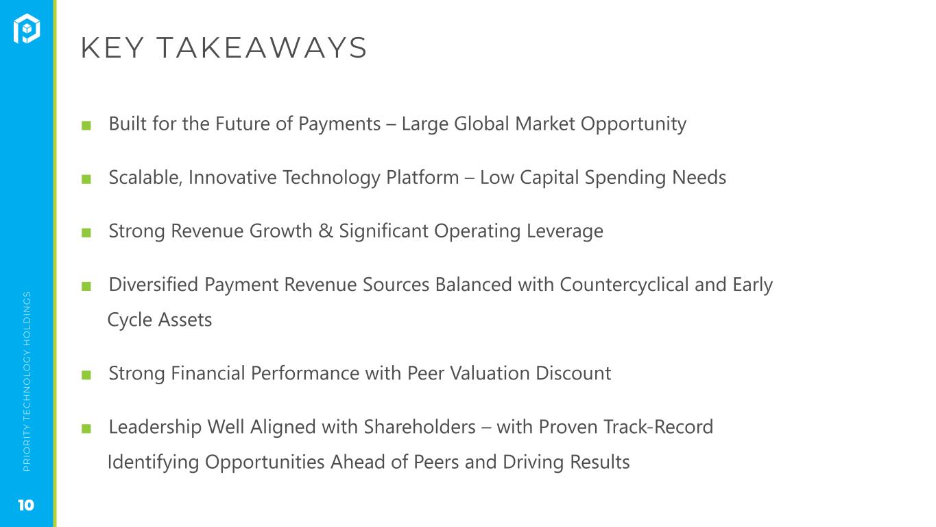 P R IO R IT Y T E C H N O L O G Y H O L D IN G S 9 STRONG FINANCIAL PERFORMANCE with PEER VALUATION DISCOUNT ENTERPRISE VALUE MULTIPLE 1 (1) Enterprise Value divided by YTD Adjusted EBITDA through Q2 annualized. Square’s multiple of 101.4 is an extreme outlier and is not reflected above. Management calculations based on publicly available information. 9.8 27.9 21.3 15.8 23.8 15.8 16.6 - 5.0 10.0 15.0 20.0 25.0 30.0 Priority Repay Paya Paysafe Fiserv Global Payments FIS Enterprise Value / Annualized EBITDA ■ Revenue CAGR2: 16% ■ Adj. EBITDA CAGR2: 35% ■ Adj. EBITDA as % of Gross Profit: 65% ■ Gross Profit Margin: 38% ■ Free Cash Flow Yield4 ~45% ■ Recurring Net Revenue: ~94% PRTH KEY PERFORMANCE METRICS 3 (2) 3-year CAGR (3) Performance Metrics based on 2021 Pro Forma (4) Free cash flow is Adjusted EBITDA less cash interest, cash dividends, estimated cash taxes, and scheduled debt repayment
