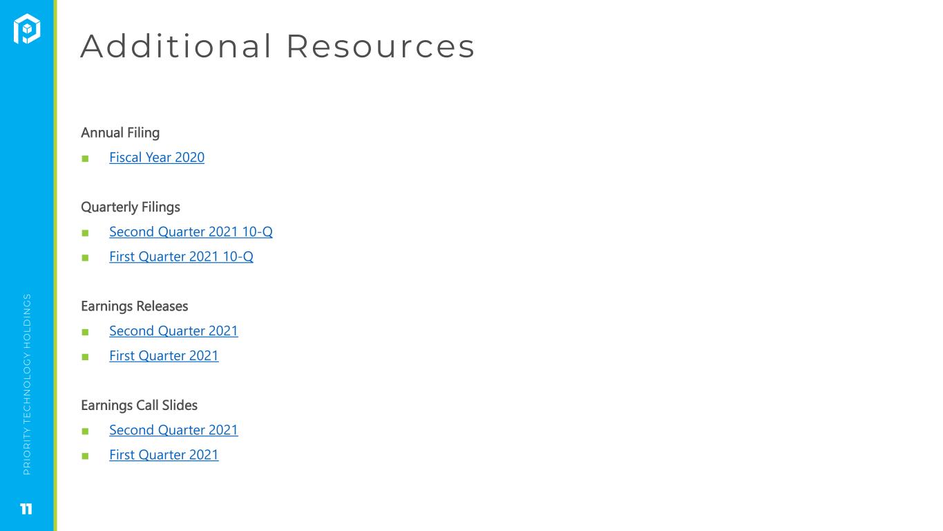 P R IO R IT Y T E C H N O L O G Y H O L D IN G S Additional Resources P R IO R IT Y T E C H N O L O G Y H O L D IN G S 11 Annual Filing ■ Fiscal Year 2020 Quarterly Filings ■ Second Quarter 2021 10-Q ■ First Quarter 2021 10-Q Earnings Releases ■ Second Quarter 2021 ■ First Quarter 2021 Earnings Call Slides ■ Second Quarter 2021 ■ First Quarter 2021